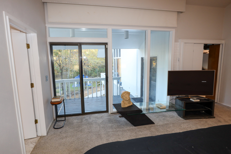 Massage Room / Jacuzzi: A 12-person enclosed Jacuzzi occupies the former massage room — overlooking forest views. Decks connect the bedrooms and lead outdoors to the pool and pond and shaded sitting areas without entering the main house.
