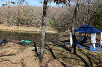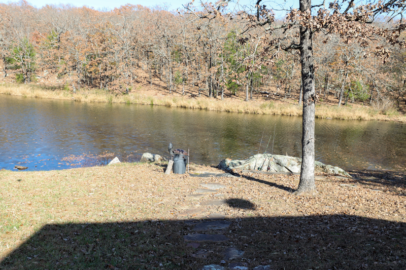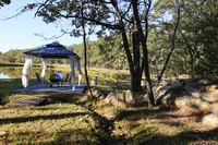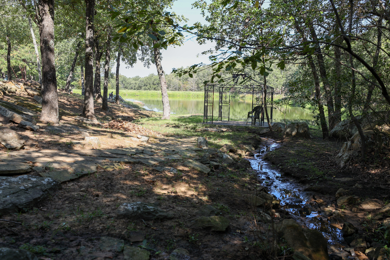 Outdoor Living & Nature: Stone walkways lead to fishing and kayaking areas, a gazebo beside the brook, and gated RV parking area with forest trails beyond.