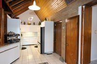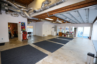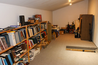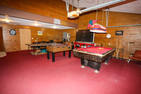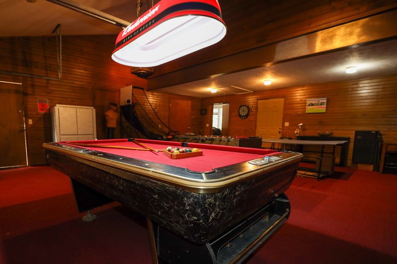 Game Room with Hidden Loft: A large wood-paneled game room features pool table, ping-pong, foosball, media space, large closet, and hidden loft.