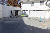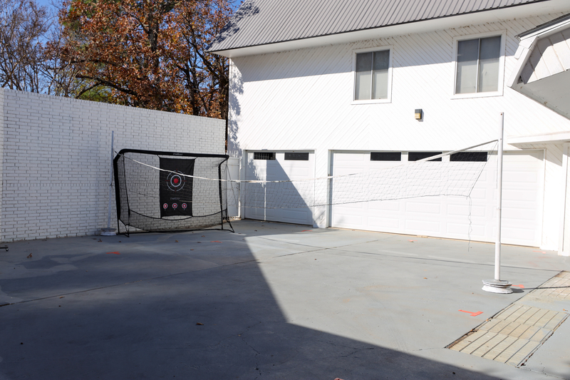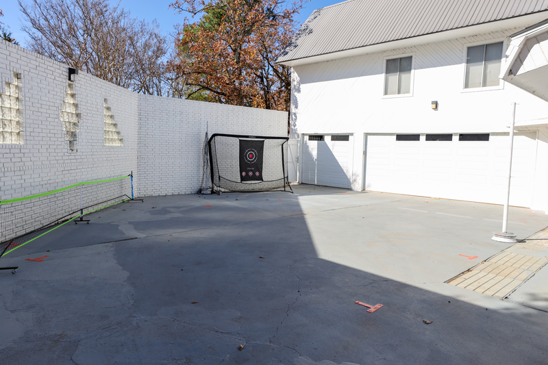 Entry & Grounds: A long-lit fence and wrought-iron gated entrance leads to a private 3-car garage and guest facility built into the hillside with a self-designed aqueduct system channeling water beneath the home. The recreation area accommodates a pickleball/volleyball space, golf driving net, and a 40-foot scuba-capable pool.